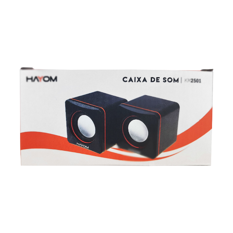 Marca:Hayom Modelo:KM2501 Especificações Técnicas:• Potência: 6W• Alimentação: Cabo USB 5V• Conector de Áudio: P2 3,5mm• Instalação: Fácil instalação (Plug & Play) Conteúdo da Embalagem:• 1 Caixa de Som Multimídia 6W