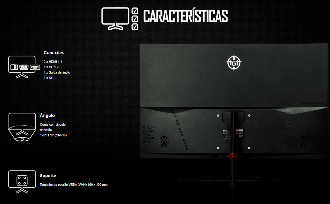 Características: Compatível com G-Sync e FreeSync, Filtro de luz azul (Blue Light Filter), VESA 100x100mm, Compatível com PS4, PS5, Xbox e PC