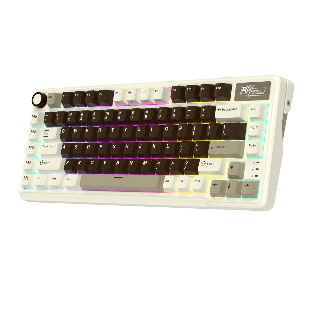 Teclado sem fio de 85 teclas com modo triplo de conexão, botão de volume em metal e teclas personalizados M1-M5. Diversas opções de retroiluminação RGB, teclas PBT com perfil Cherry e interruptores RK bem lubrificados e substituíveis a quente. Capacidade da bateria de 8000 mAh.