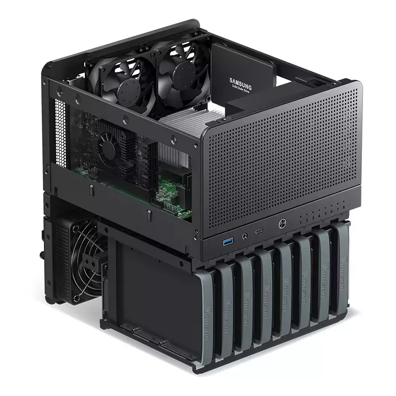 O N3 apresenta um design modular exclusivo, utilizando a metade inferior da unidade principal como um compartimento de unidade dedicado de 3,5 polegadas. A empresa acredita que essa configuração irá permitir uma utilização eficiente do espaço, garantindo fácil acessibilidade às unidades. Além das oito baias de 3,5 polegadas, o gabinete inclui uma baia de sombra de 2,5 polegadas localizada na parte superior da unidade principal, permitindo a utilização de uma unidade de armazenamento de 3,5 polegadas mesmo na ausência de um slot M.2 na placa-mãe
